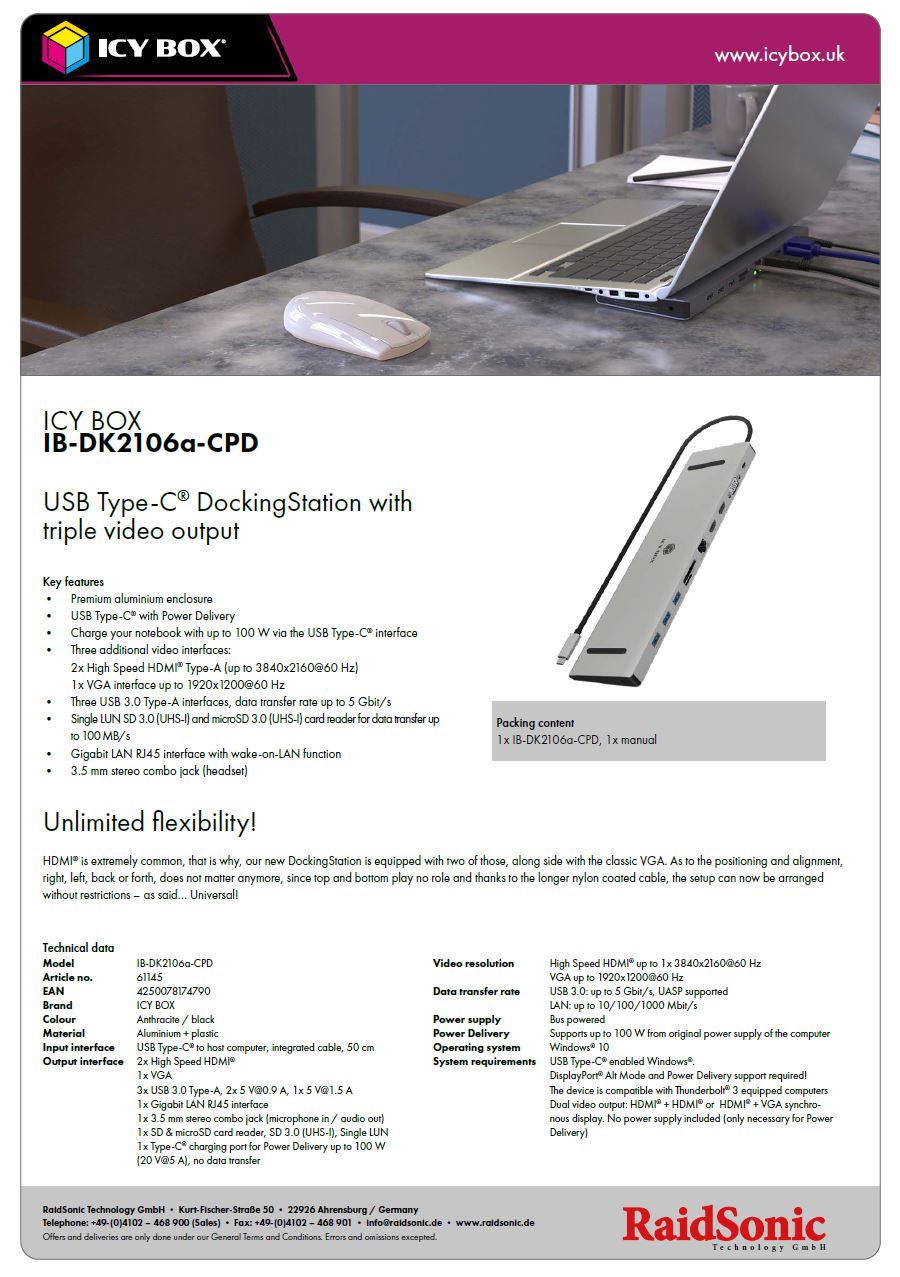 ICY BOX IB-DK2106a-CPD Wired USB 3.2 Gen 1 (3.1 Gen 1) Type-C Anthracite, Black