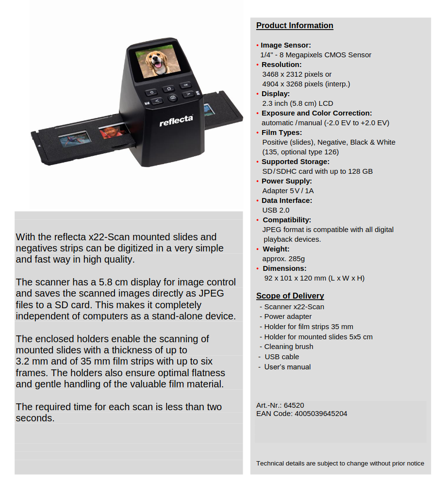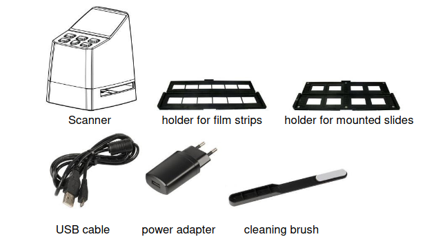 - Scope of delivery: x22 scanner, power adapter, holder for film strips 35 mm, holder for framed slides 5x5 cm, cleaning brush, USB cable, manual