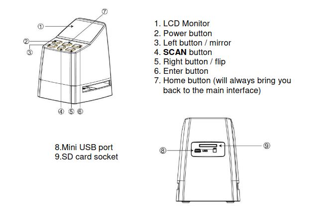 The enclosed holders enable the scanning of four framed slides with a thickness of up to 3.2 mm and of 35 mm film strips with up to six images. The holders ensure that the originals are perfectly flat and that the valuable film material is handled gently. As soon as slides or negative strips are inserted into the scanner using the holder, they can be viewed and selected immediately on the display, whereby negatives are of course shown directly as positives. With a single push of a button, the images can be saved directly as a JPEG file on an SD card with up to 128GB. It is also possible to transfer the finished scans to a computer via the integrated USB 2.0 interface. The power is supplied via the supplied 5V / 1A power supply (micro USB).