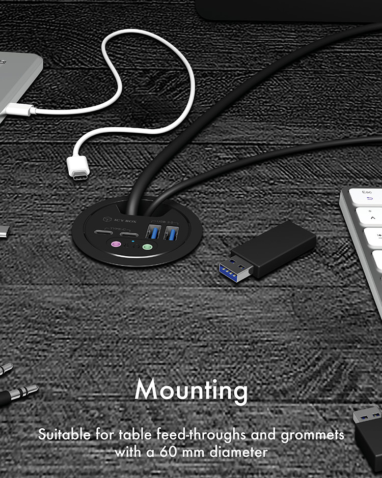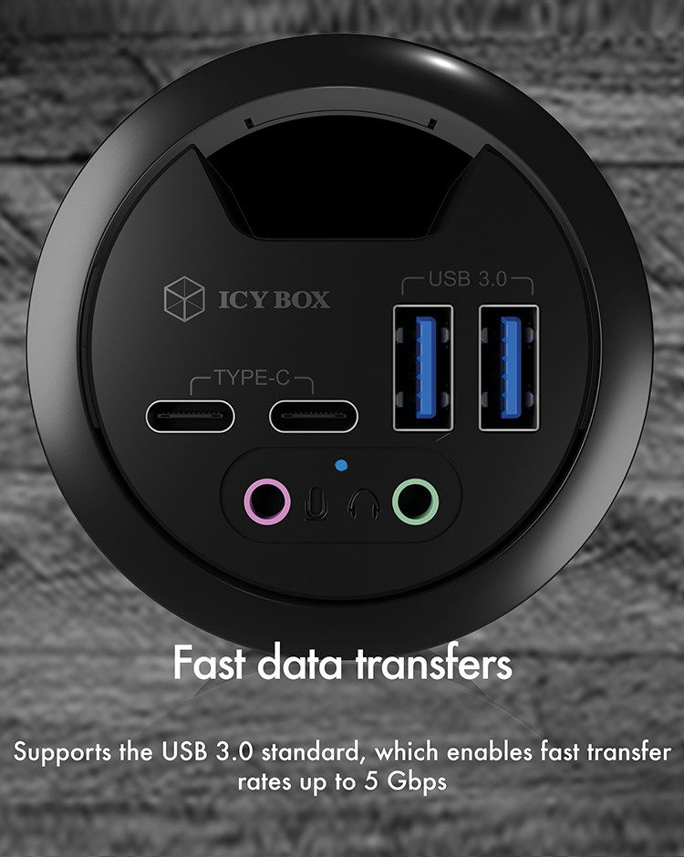 With the IB-HUB1403B you can easily connect your frequently used USB Type-C™ and USB Type-A devices as well as your headset within sight and reach on your desk.