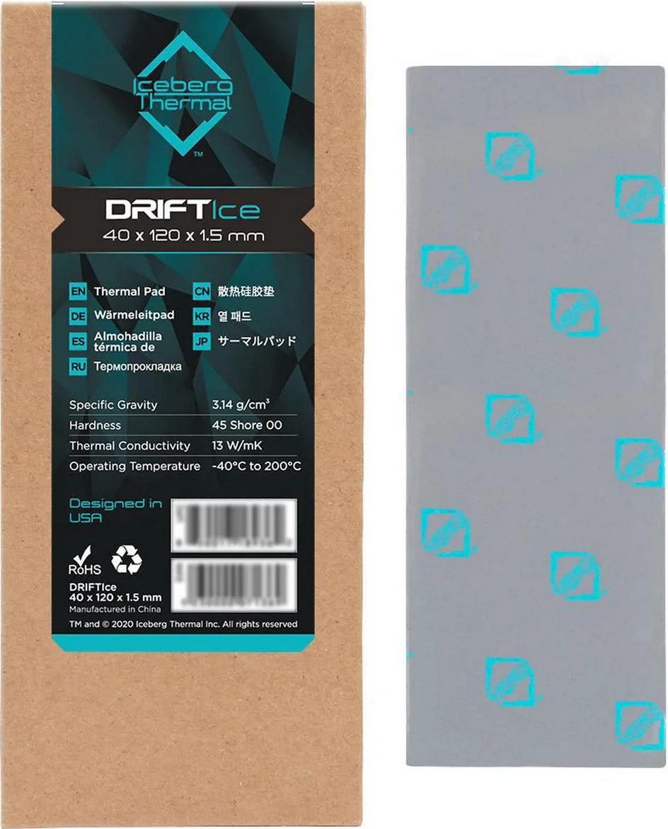 Iceberg Thermal DRIFTIce. Type: Thermal pad, Thermal conductivity: 13 W/m·K, Product colour: Grey. Width: 40 mm, Depth: 120 mm, Height: 1.5 mm. Quantity per pack: 1 pc(s)