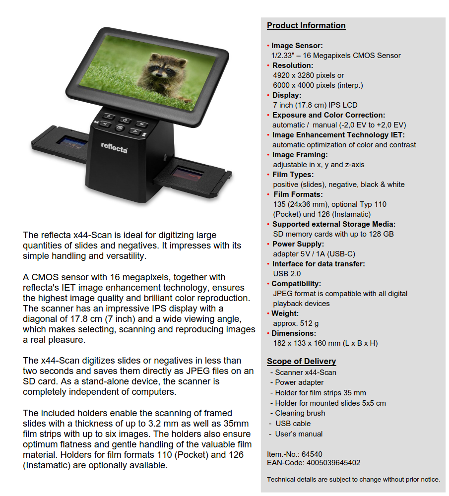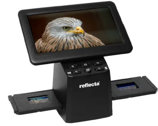 - The reflecta x44-Scan digitizes 35mm negatives and slides very easily and without the use of a computer. The display of the reflecta x44-Scan measures 17.8 cm (7 inches) and makes selecting and scanning old films and slides a pleasure. Of course, the color display is also used to check the scan and to adjust the color and exposure, because in addition to the automatic function, both the exposure and the color reproduction can be corrected manually before the scanning process.