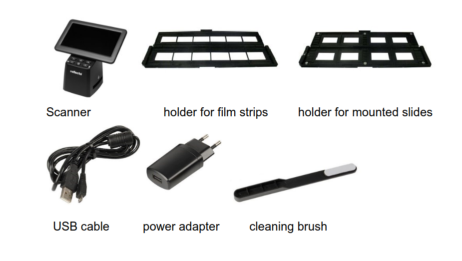 - Scope of delivery: x44-Scan, power adapter, holder for film strips 35 mm, holder for framed slides 5x5 cm, cleaning brush, USB cable, manual