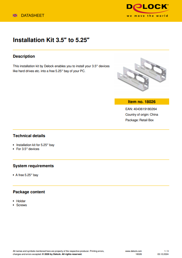 | Installation kit 3.5 > 5.25 DeLOCK 18026, Metal, Silver |