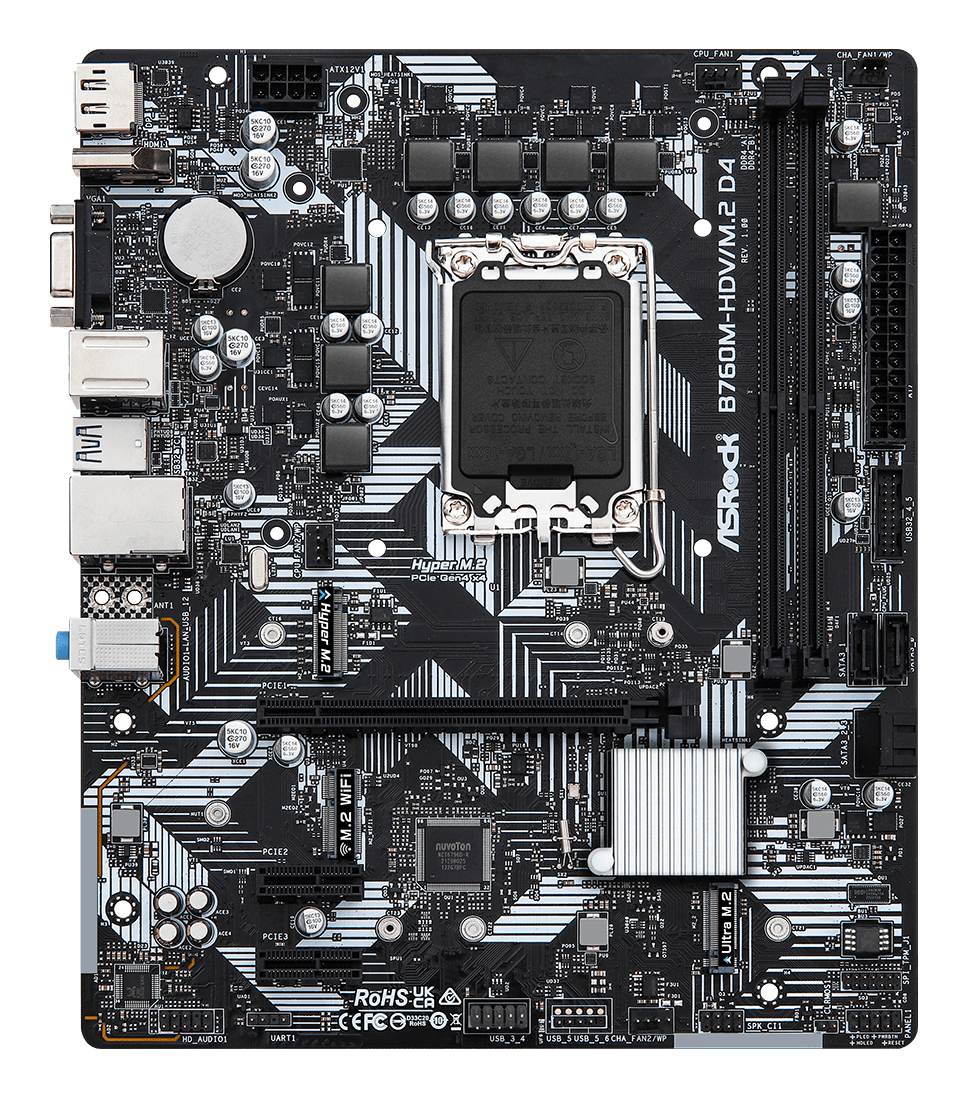| Micro ATX, Intel B760, 2 x DDR4 DIMM, 7.1 CH HD Audio, Gigabit LAN Asrock B760M-HDV/M.2 D4, Intel, LGA 1700, Intel® Core™ i3, Intel® Core™ i5, Intel® Core™ i7, Intel® Core™ i9, DDR4-SDRAM, 64 GB, DIMM |