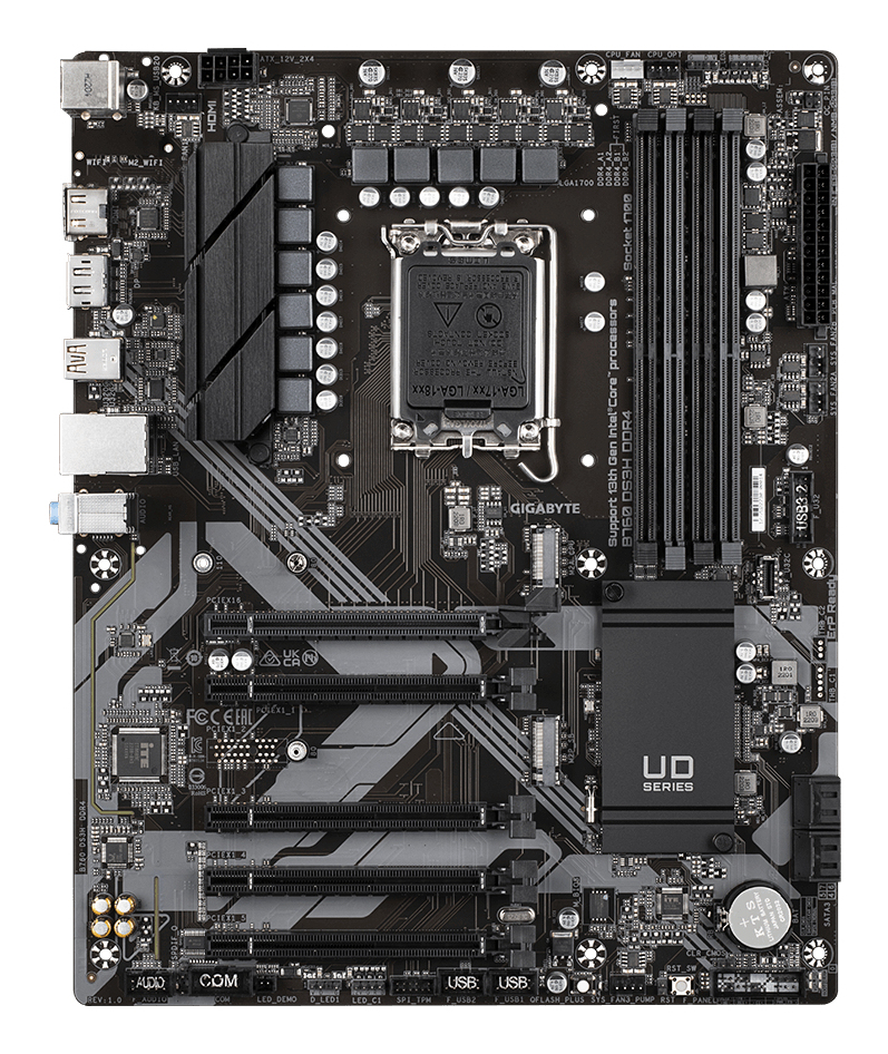 | B760 DS3H DDR4 Motherboard - Supports Intel Core 14th CPUs, 18+2+1 Phases Digital VRM, up to 5333MHz DDR4 (OC), 2xPCIe 4.0 M.2, GbE LAN, USB 3.2 Gen 2 GIGABYTE B760 DS3H DDR4 Motherboard - Supports Intel Core 14th CPUs, 18+2+1 Phases Digital VRM, up to 5333MHz DDR4 (OC), 2xPCIe 4.0 M.2, GbE LAN, USB 3.2 Gen 2, Intel, LGA 1700, Intel® Celeron®, Intel® Core™ i3, Intel® Core™ i5, Intel® Core™ i7, Intel® Core™ i9,..., LGA 1700, 128 GB, DDR4-SDRAM |