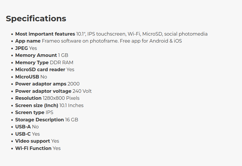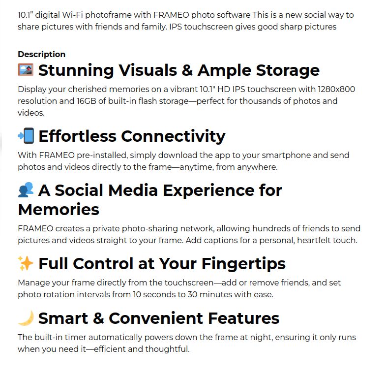 10.1” digital Wi-Fi photoframe with FRAMEO photo software This is a new social way to share pictures with friends and family. IPS touchscreen gives good sharp pictures