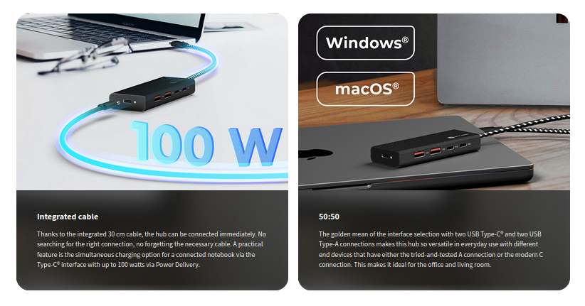 Thanks to the integrated 30 cm cable, the hub can be connected immediately. No searching for the right connection, no forgetting the necessary cable. A practical feature is the simultaneous charging option for a connected notebook via the Type-C® interface with up to 100 watts via Power Delivery.