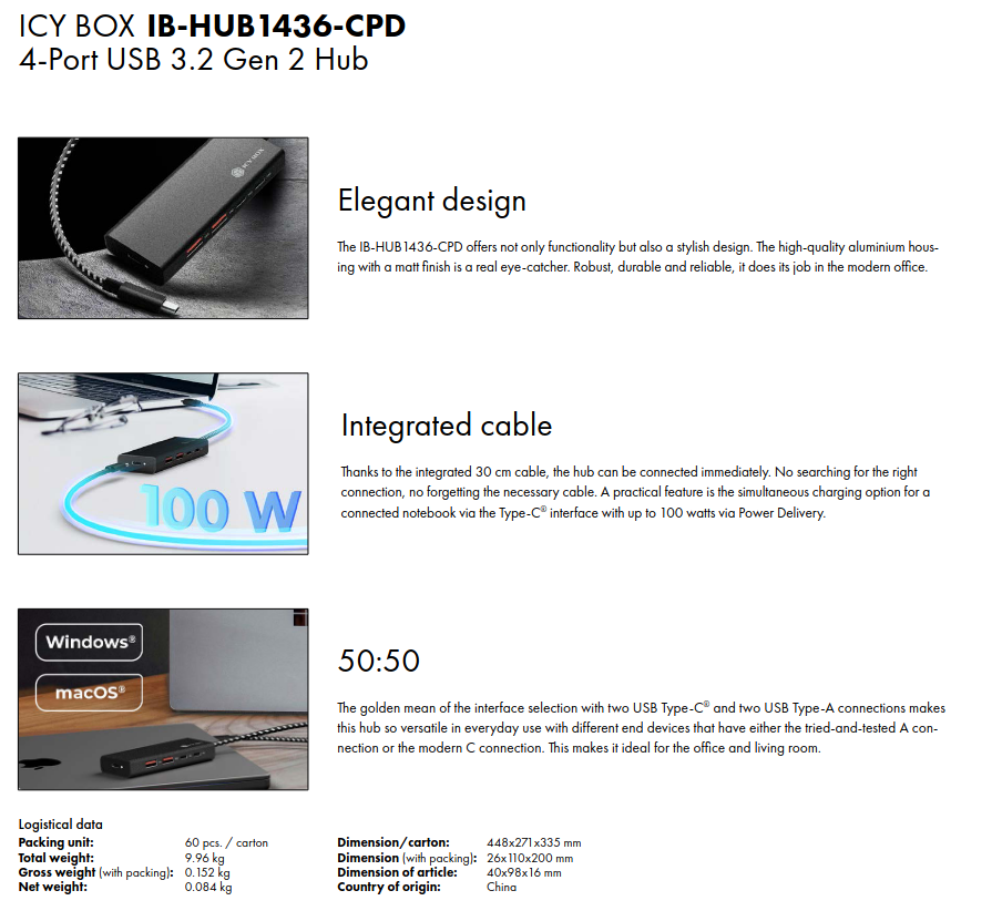 4-port hub with USB 3.2 Gen 2 Type-C connection and PD 100 W ICY BOX IB-HUB1436-CPD, Wired, USB 3.2 Gen 2 (3.1 Gen 2) Type-A, 100 W, Black, 10 Gbit/s, Aluminium |